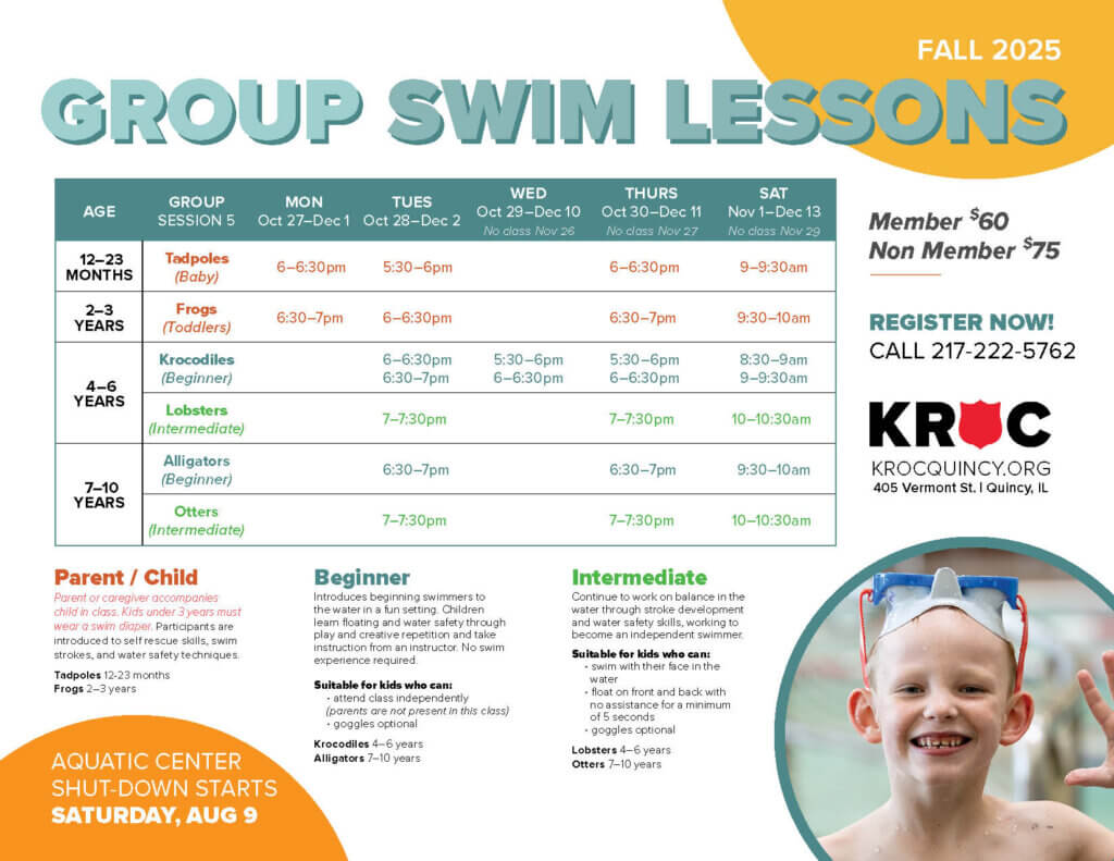 The Quincy Kroc Center’s aquatics department, complete with certified American Red Cross Certified lifeguards, is dedicated to providing top-quality classes and training. In addition to the facility being Infant Swim of America certified, our trained instructors are able to teach swim lessons to all ages and abilities.