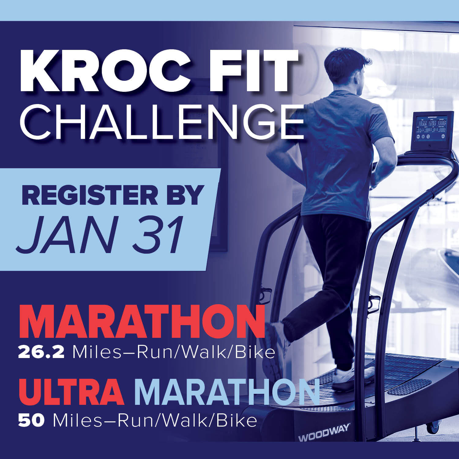 The Kroc Fit Challenge returns February 1! Use a treadmill, elliptical, our indoor track, bike, or a combo of all four to finish 26.2 miles (walk or run) in 28 days. Or sign up for the ultra marathon and finish 50 miles within 28 days.